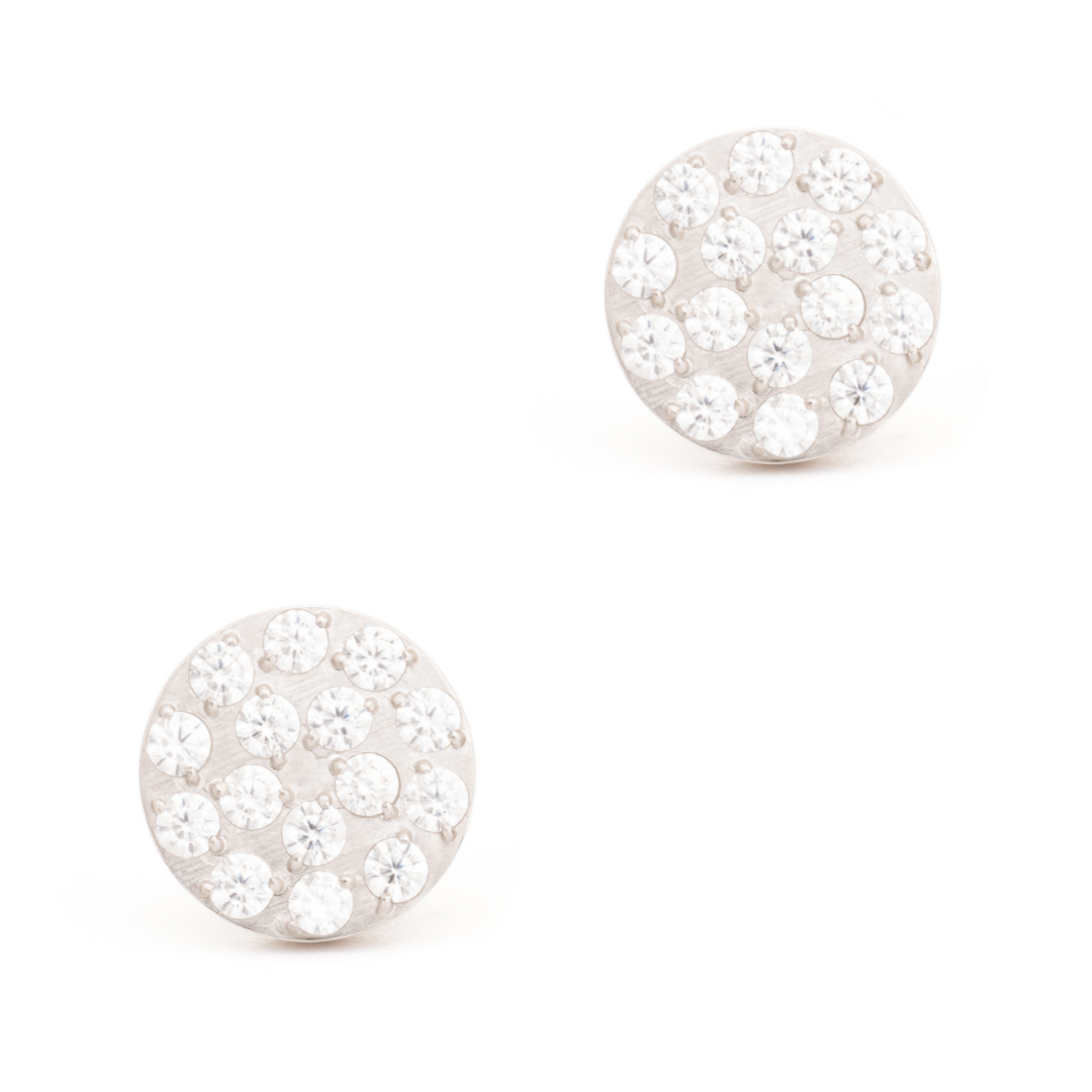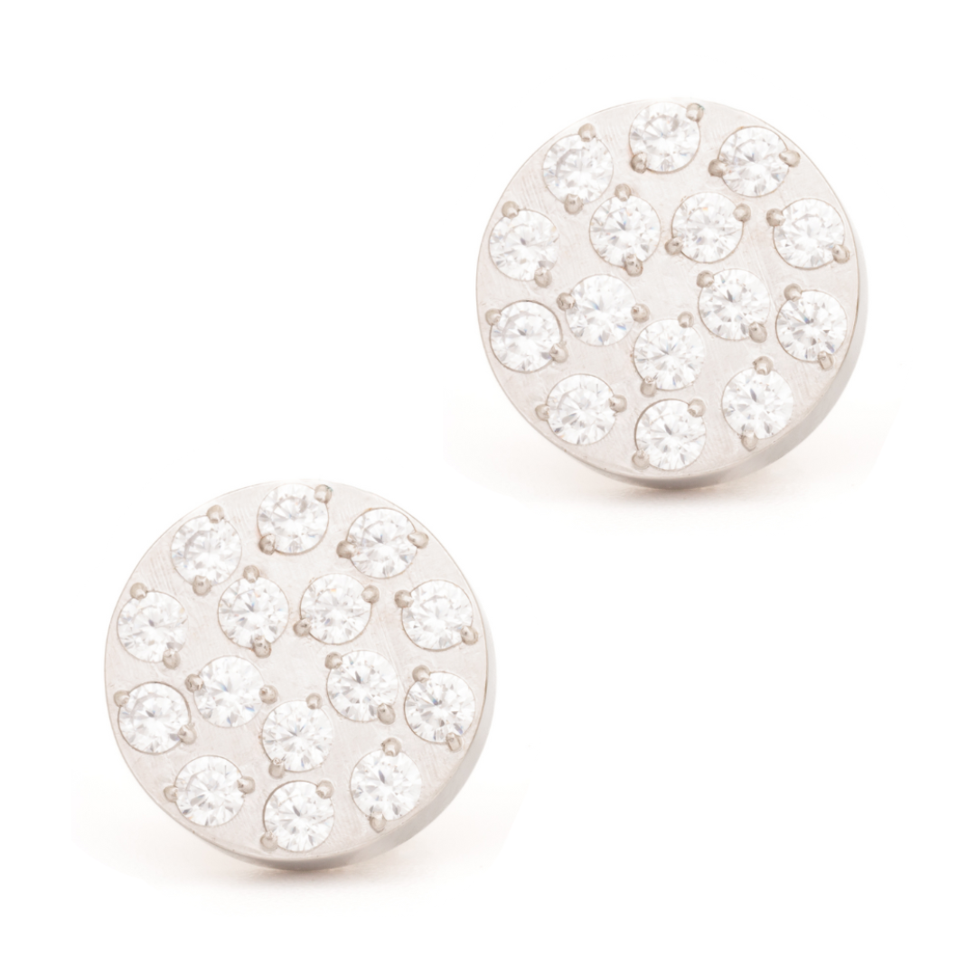 Galadrial Titanium är ett par glamorösa örhängen för en riktigt lyxig look. En rund platta med mjuka kanter för extra bekvämlighet, i glansig titan med hela 15 sagolika kristallstenar i stilrent vitt.