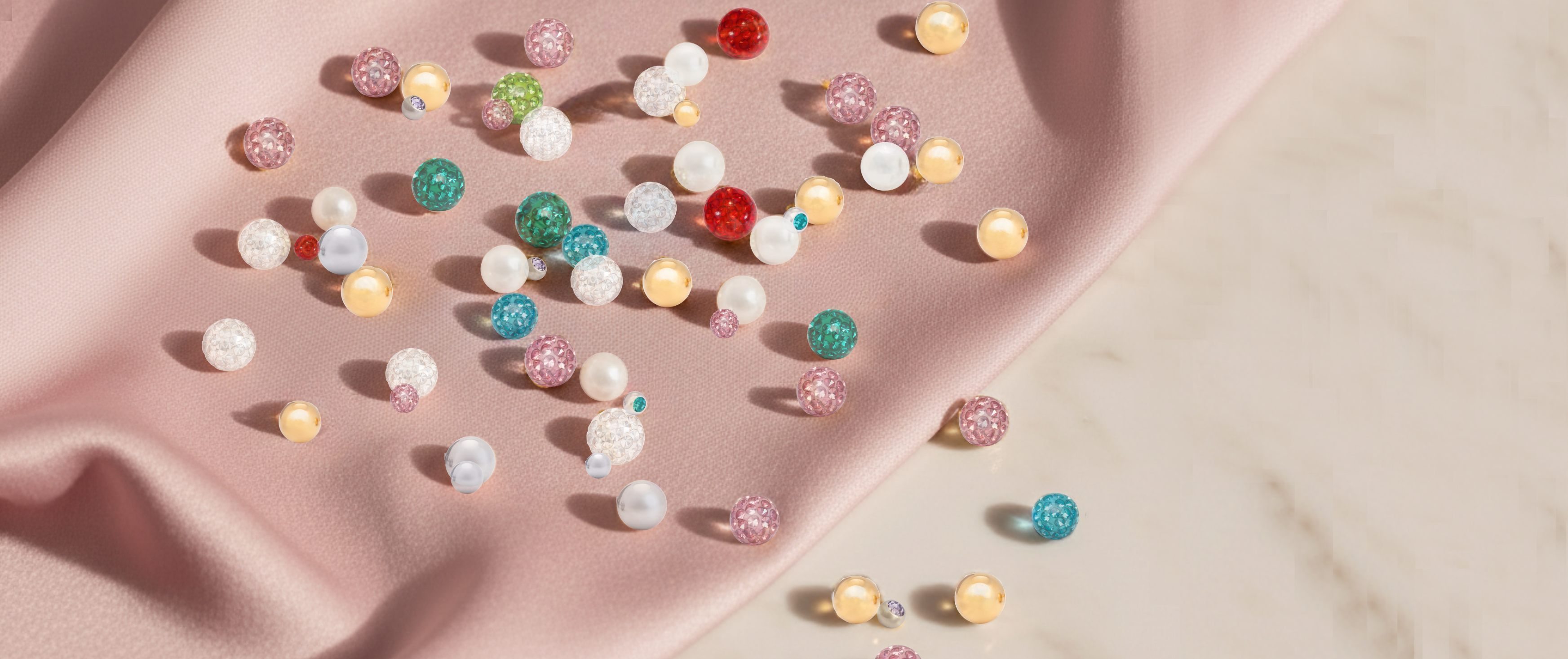 Tidlösa pärlor med strålande kristallstenar i flera olika färger.