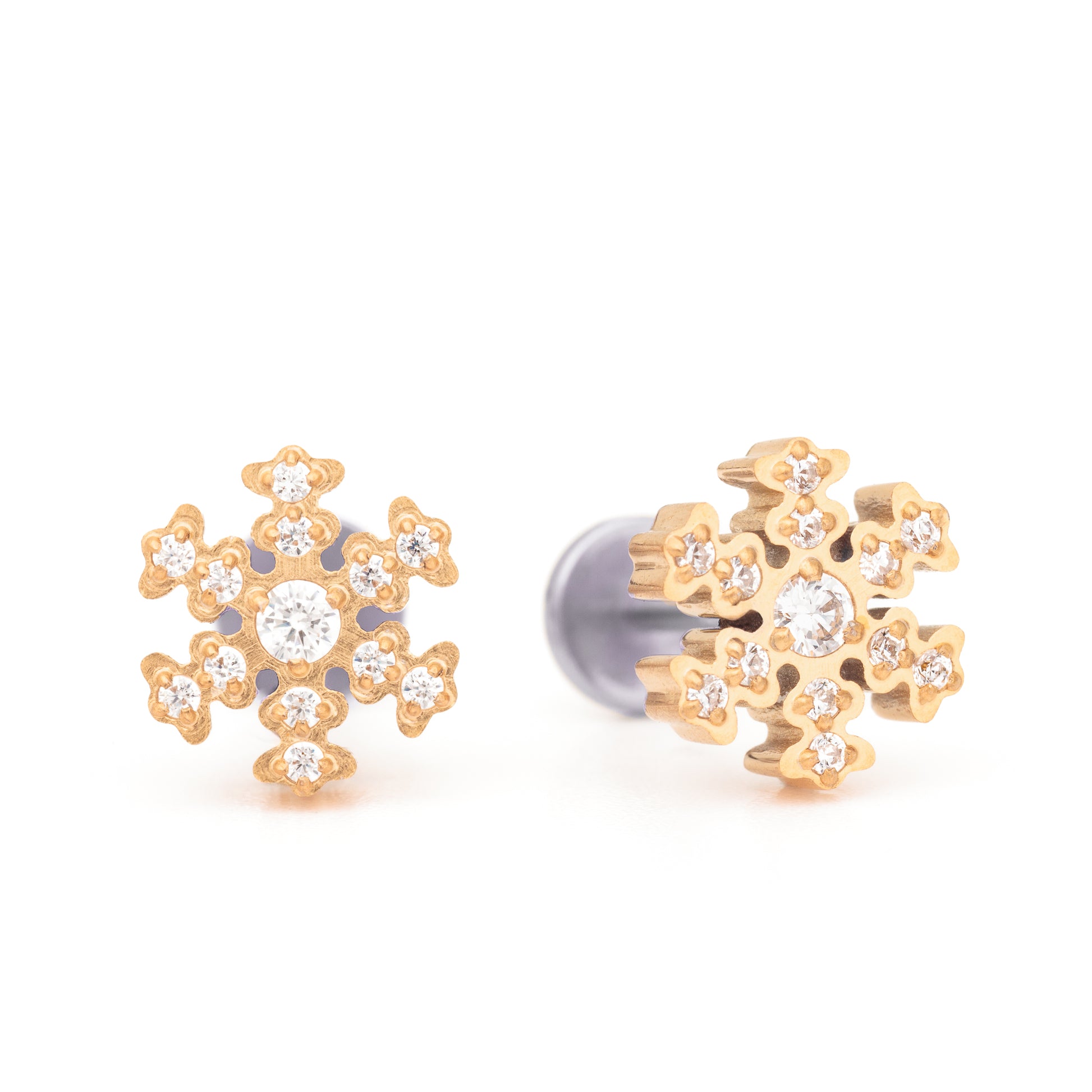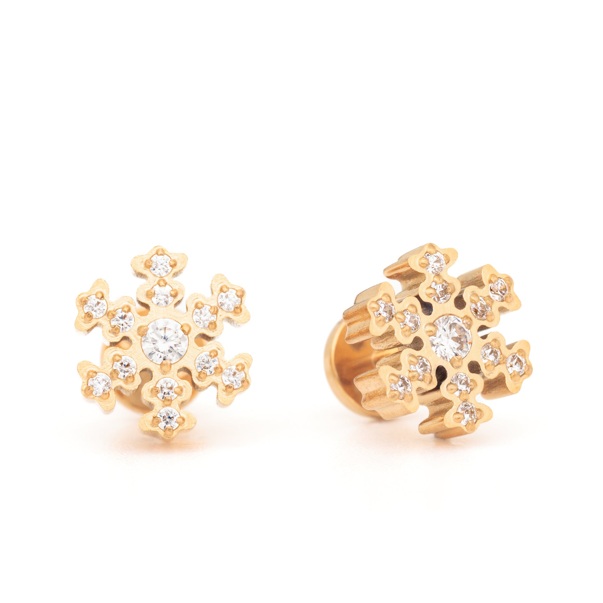 Ett par lyxiga och iögonfallande örhängen, snöflingor i guldpläterat titan. Den gyllene guldpläteringen ger ett varmt och lyxigt intryck trots sin kyliga design. Snöflingan är fylld av 13 stycken kloinfattade gnistrande kristallstenar med briljantform i stilrent vitt.
