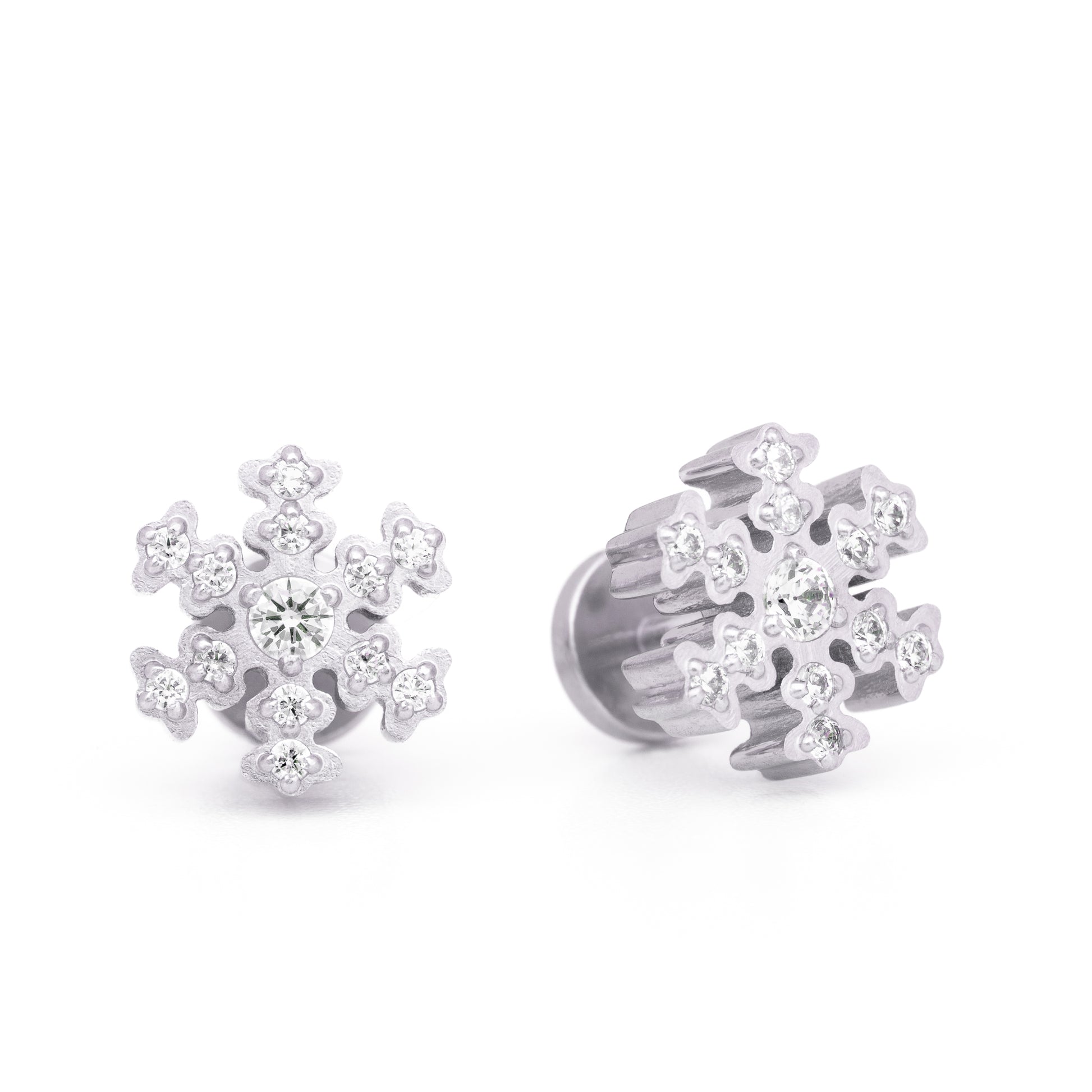 Ett par lyxiga och iögonfallande örhängen, snöflingor i glansigt titan. Titan är identiskt med silver, fast snäppet bättre. Snöflingan är fylld av 13 stycken kloinfattade gnistrande kristallstenar med briljantform i stilrent vitt.