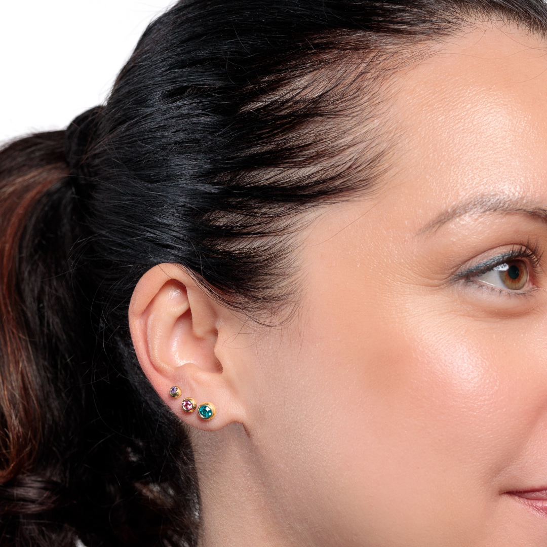 Modellen Josefine har alla storlekar i sitt öra och har kombinerat detta med Ariel Gold 4mm högst på örat (Helix).